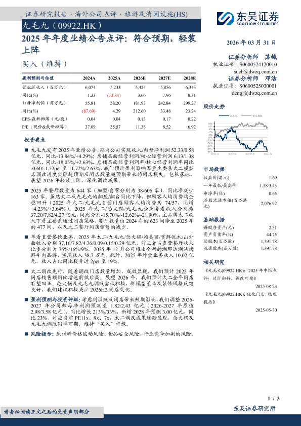 投资评级 财报分析 太二 九毛九 盈利预测