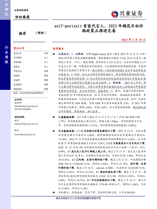 【兴业证券】【20230219】纺织服装行业周报:self-portrait首宣代言人,2023年棉花目标价格政策正推进完善-18页