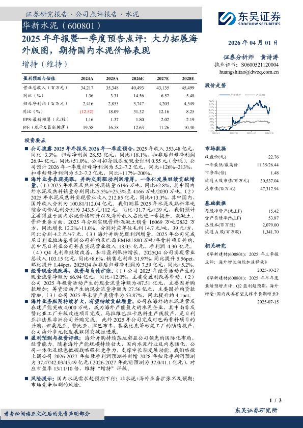 【东吴证券】【202604】2025年年报暨一季度预告点评:大力拓展海外版图,期待国内水泥价格表现-3页