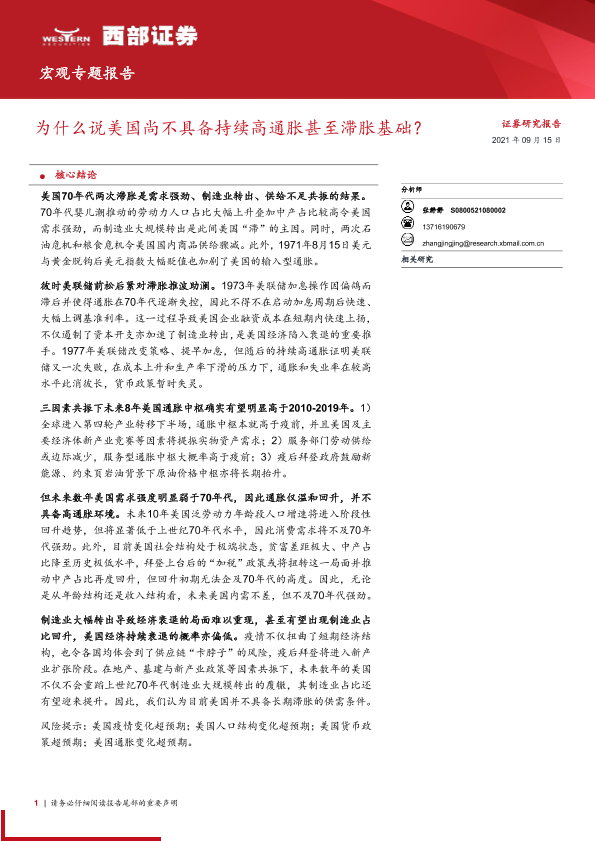 【西部证券】【20210915】宏观专题报告:为什么说美国尚不具备持续高通胀甚至滞胀基础?-18页