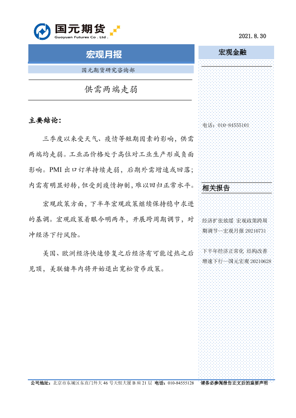 【国元期货】【20210830】宏观月报:供需两端走弱-21页