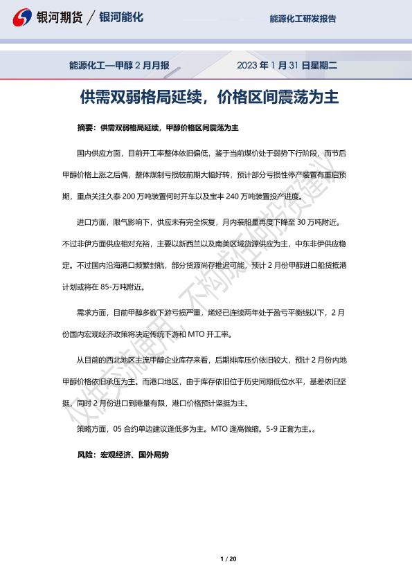 【银河期货】【20230131】能源化工_甲醇2月月报-20页