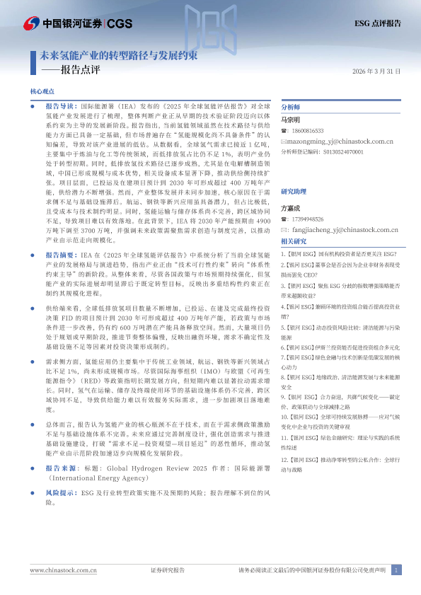 能源转型 氢能 政策建议 行业分析 ESG研究