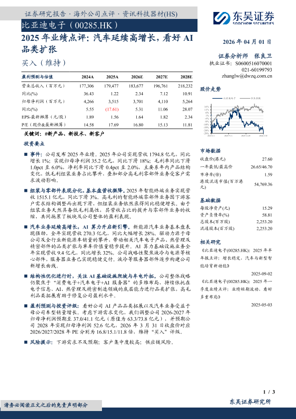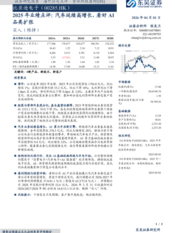 【东吴证券】【202604】比亚迪电子(00285.HK):2025年业绩点评:汽车延续高增长,看好AI品类扩张-3页