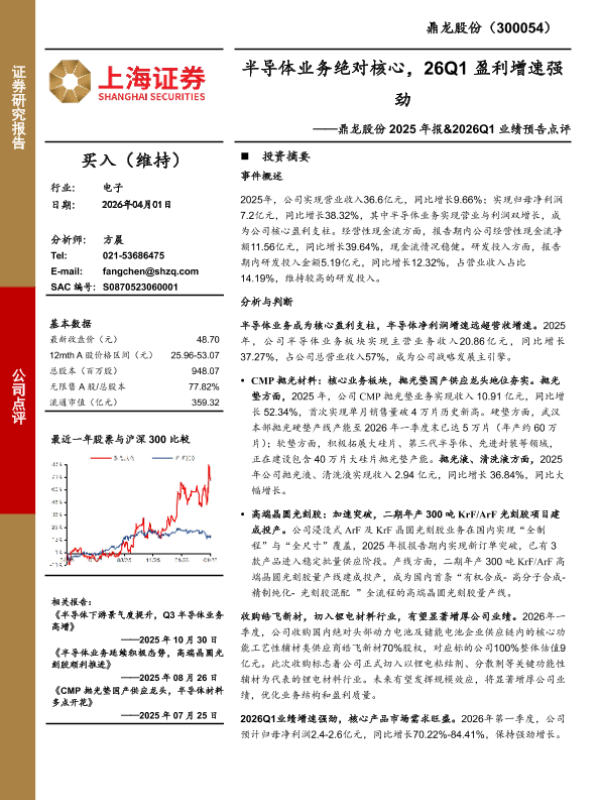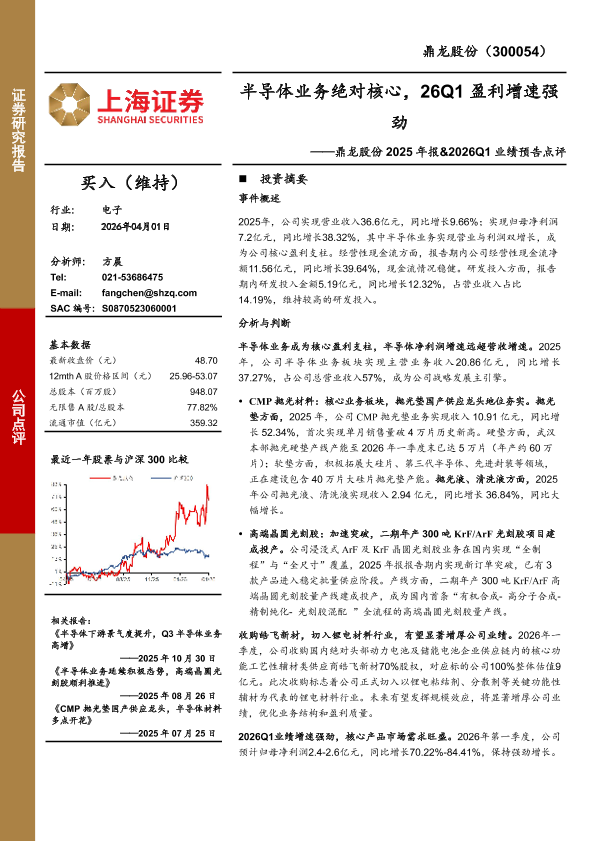【上海证券】【202604】鼎龙股份2025年报&2026Q1业绩预告点评:半导体业务绝对核心,26Q1盈利增速强劲-4页