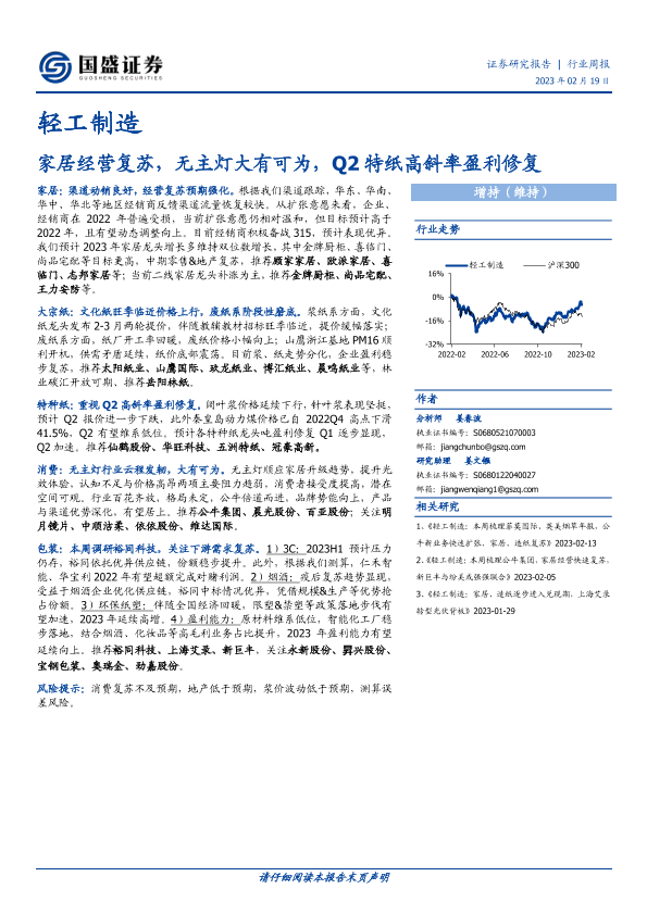 【国盛证券】【20230219】轻工制造行业周报:家居经营复苏,无主灯大有可为,Q2特纸高斜率盈利修复-47页