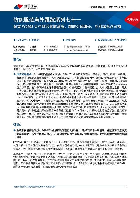 【国信证券】【202604】耐克FY26Q3大中华区复苏承压,跑鞋引领增长,毛利率拐点可期-10页