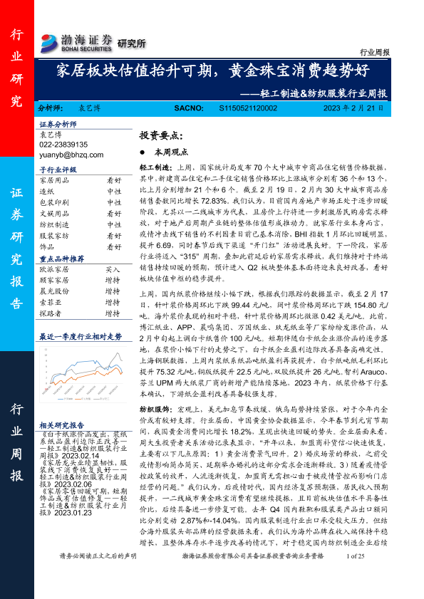 【渤海证券】【20230221】轻工制造&纺织服装行业周报:家居板块估值抬升可期,黄金珠宝消费趋势好-25页