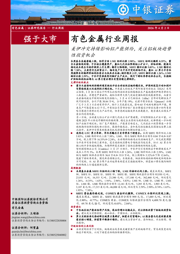 【中银证券】【202604】有色金属行业周报:美伊冲突持续影响铝产能供给,关注铝板块趋势性投资机会-18页
