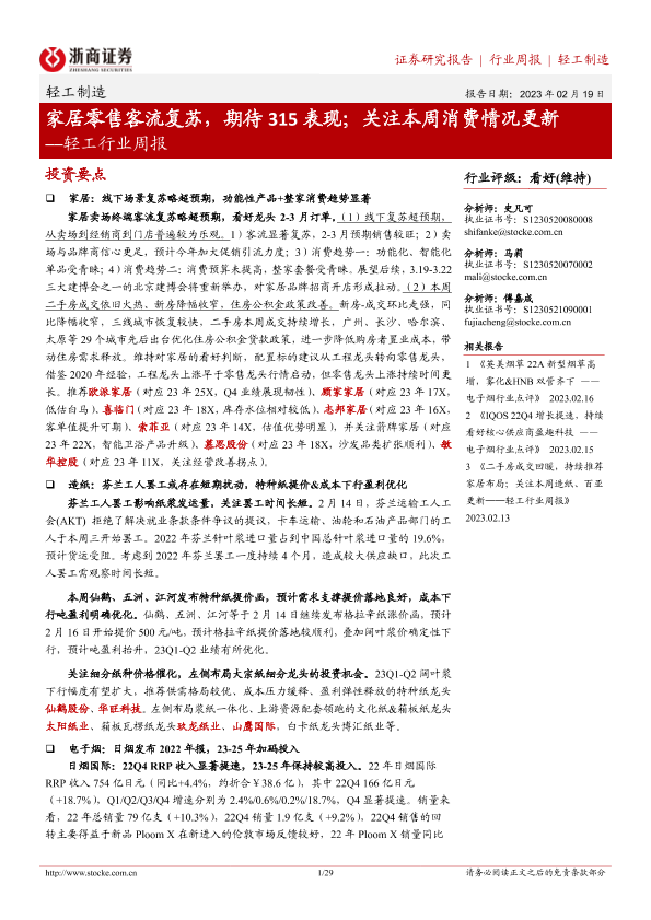【浙商证券】【20230219】轻工行业周报:家居零售客流复苏,期待315表现;关注本周消费情况更新-29页