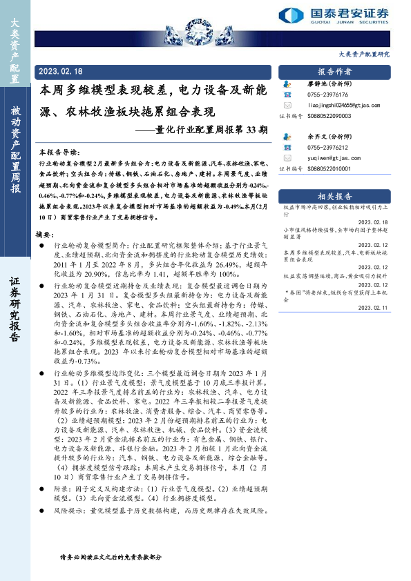 【国泰君安证券】【20230218】量化行业配置周报第33期:本周多维模型表现较差,电力设备及新能源、农林牧渔板块拖累组合表现-15页