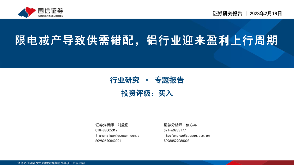 【国信证券】【20230218】金属与金属材料行业专题报告:限电减产导致供需错配,铝行业迎来盈利上行周期-26页