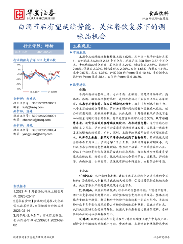 【华安证券】【20230220】食品饮料行业周报:白酒节后有望延续势能,关注餐饮复苏下的调味品机会-18页