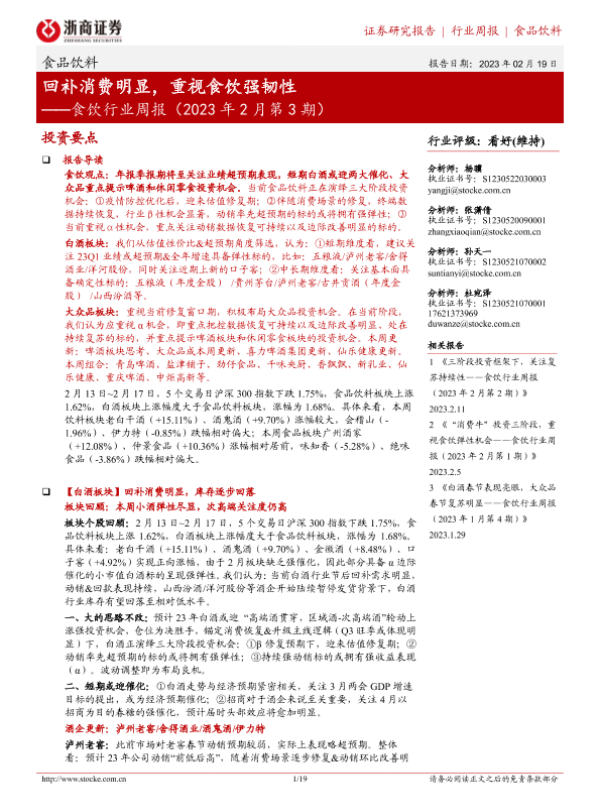 【浙商证券】【20230219】食饮行业周报(2023年2月第3期):回补消费明显,重视食饮强韧性-19页