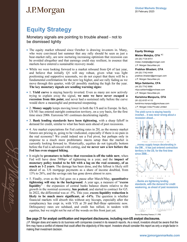 【J.P. Morgan】【20230220】Equity Strategy Monetary signals are pointing to trouble ahead-25页