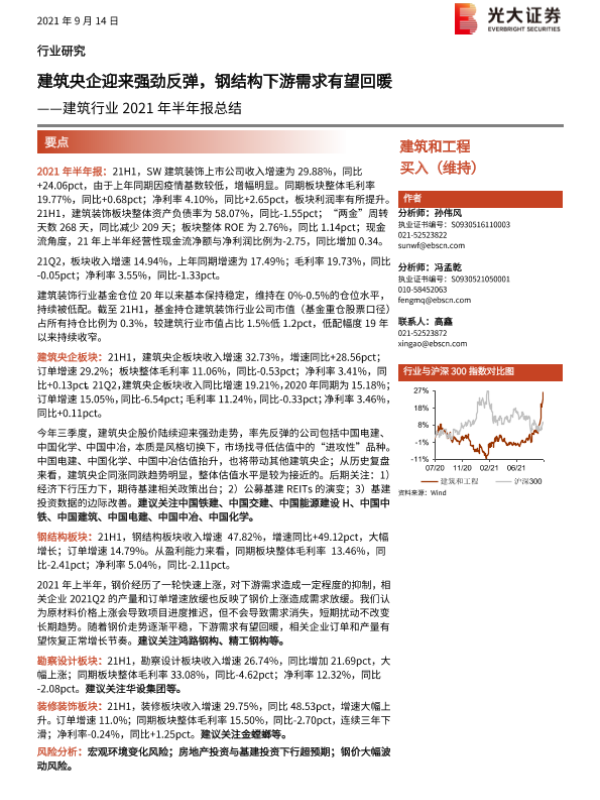【光大证券】【20210914】建筑行业2021年半年报总结:建筑央企迎来强劲反弹,钢结构下游需求有望回暖-23页
