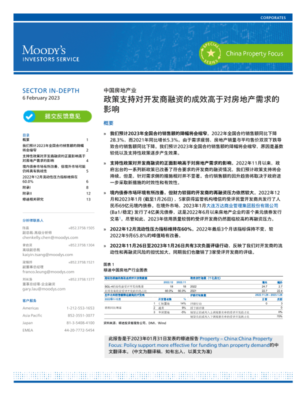 【穆迪投资者服务公司】【20230206】中国房地产业:政策支持对开发商融资的成效高于对房地产需求的影响-16页