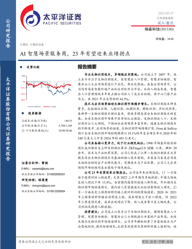业绩拐点 市场分析 投资建议 智慧场景 生物识别技术