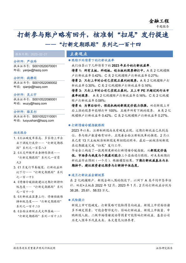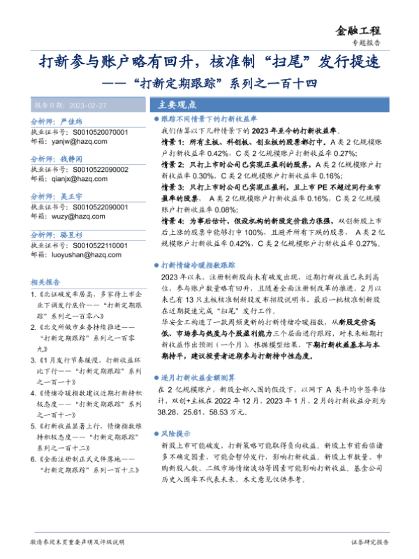 【华安证券】【20230227】“打新定期跟踪”系列之一百十四:打新参与账户略有回升,核准制“扫尾”发行提速-21页