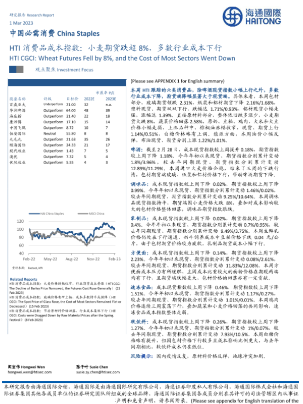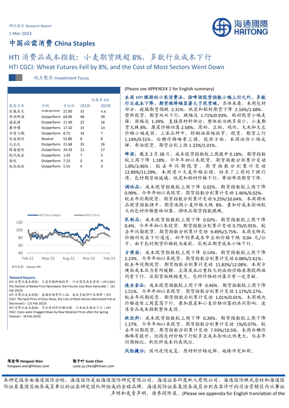 【海通证券】【20230201】中国必需消费行业HTI消费品成本指数:小麦期货跌超8%,多数行业成本下行-16页