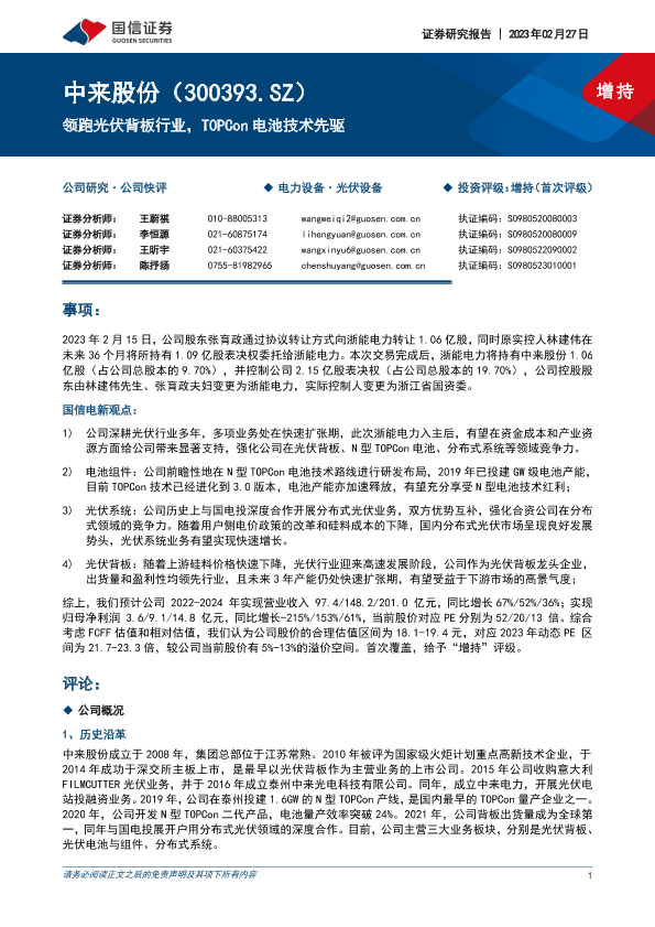 【国信证券】【20230227】中来股份(300393)领跑光伏背板行业,TOPCon电池技术先驱-21页