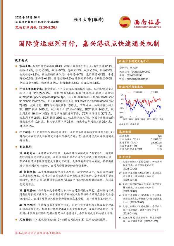 【西南证券】【20230226】交运行业周报:国际货运班列开行,嘉兴港试点快速通关机制-21页
