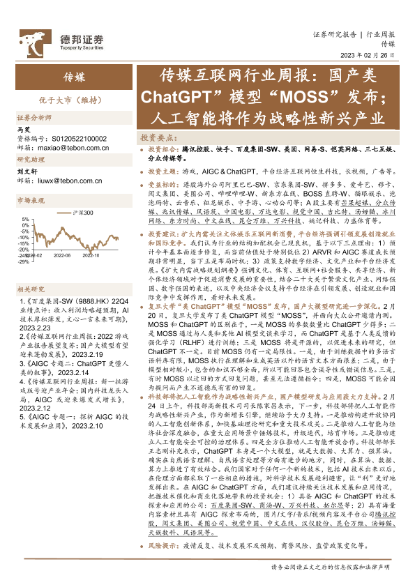 【德邦证券】【20230226】传媒互联网行业周报:国产类ChatGPT”模型“MOSS”发布;人工智能将作为战略性新兴产业-17页