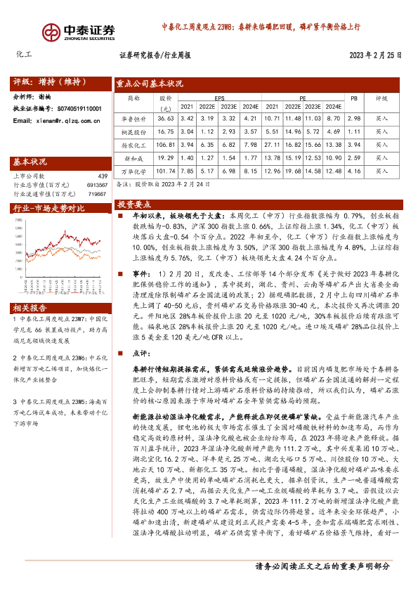 【中泰证券】【20230225】化工周度观点23W8:春耕来临磷肥回暖,磷矿紧平衡价格上行-24页