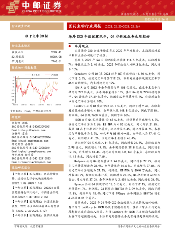 【中邮证券】【20230226】医药生物行业周报:海外CXO年报披露完毕,Q4非新冠业务表现较好-17页