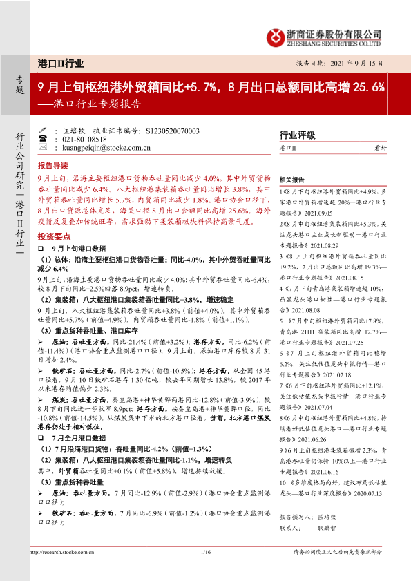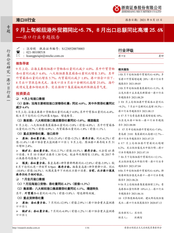 【浙商证券】【20210915】9月上旬枢纽港外贸箱同比+5.7%,8月出口总额同比高增25.6%-16页