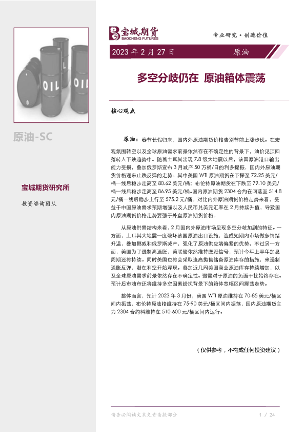 【宝城期货】【20230227】原油月报:多空分歧仍在,原油箱体震荡-27页