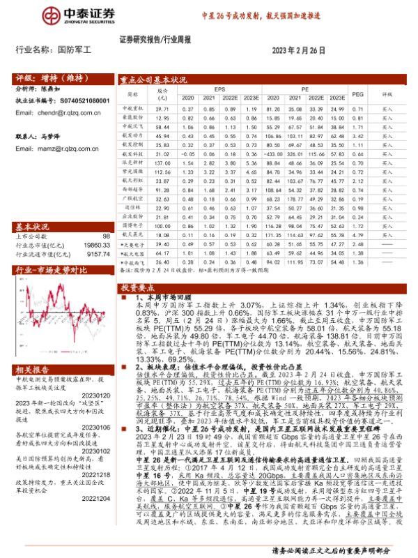 【中泰证券】【20230226】国防军工行业周报:中星26号成功发射,航天强国加速推进-20页