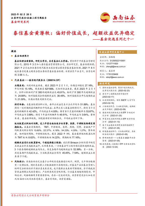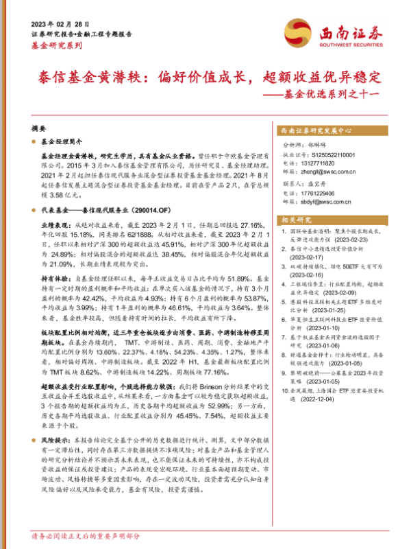 【西南证券】【20230228】基金优选系列之十一:泰信基金黄潜轶,偏好价值成长,超额收益优异稳定-25页