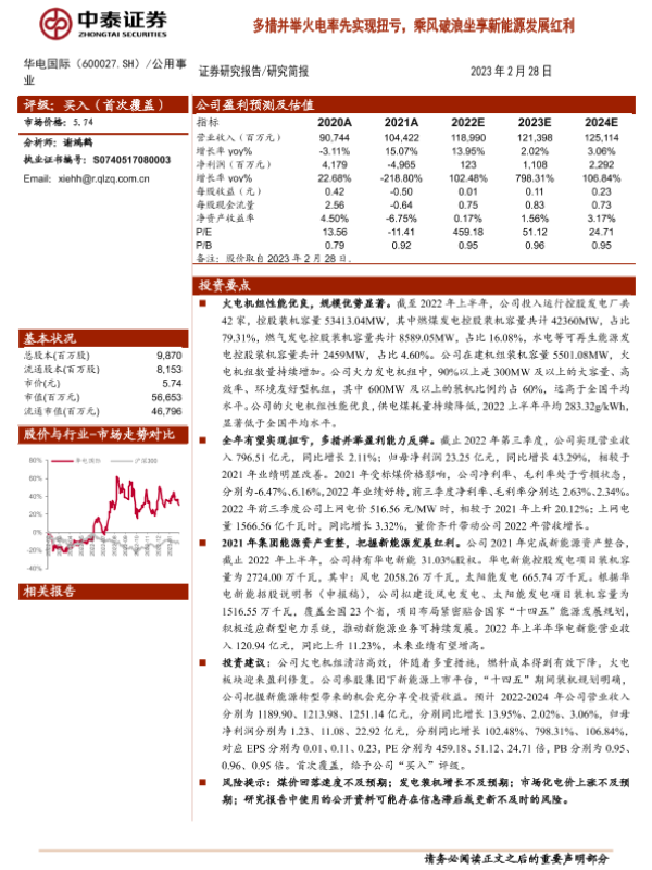 投资建议 新能源发展 火电行业 能源转型 财务分析