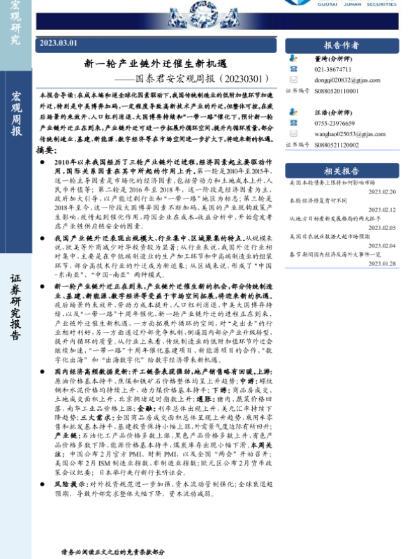 【国泰君安证券】【20230301】宏观周报:新一轮产业链外迁催生新机遇-27页