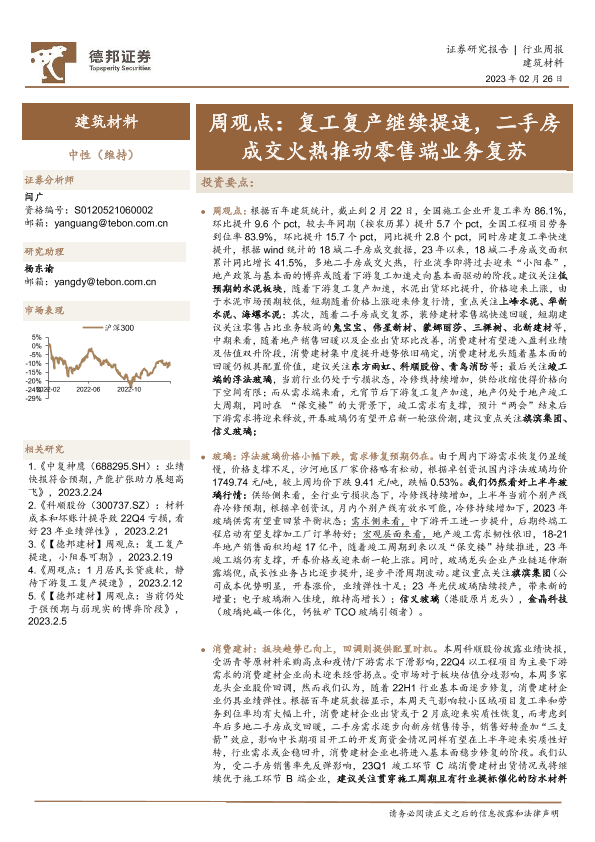 【德邦证券】【20230226】建筑材料行业周观点:复工复产继续提速,二手房成交火热推动零售端业务复苏-29页
