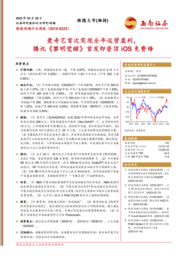 【西南证券】【20230226】影视传媒行业周报:爱奇艺首次实现全年运营盈利,腾讯《黎明觉醒》首发即登顶iOS免费榜-20页