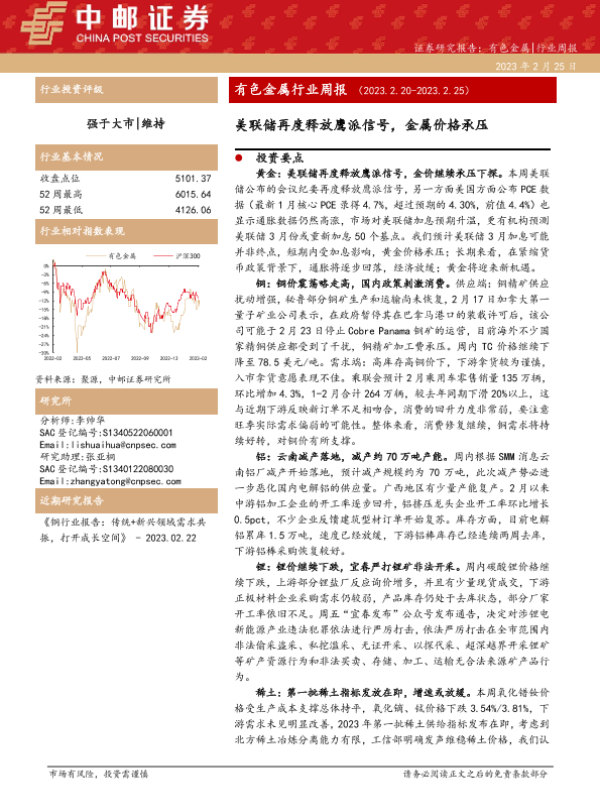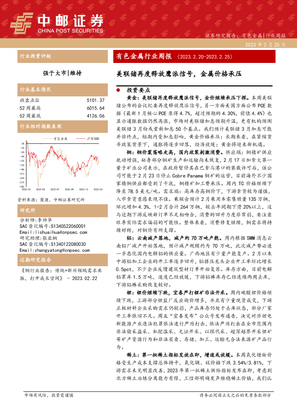 【中邮证券】【20230225】有色金属行业周报:美联储再度释放鹰派信号,金属价格承压-14页