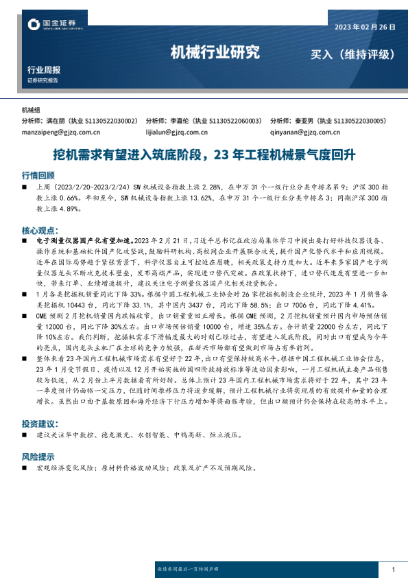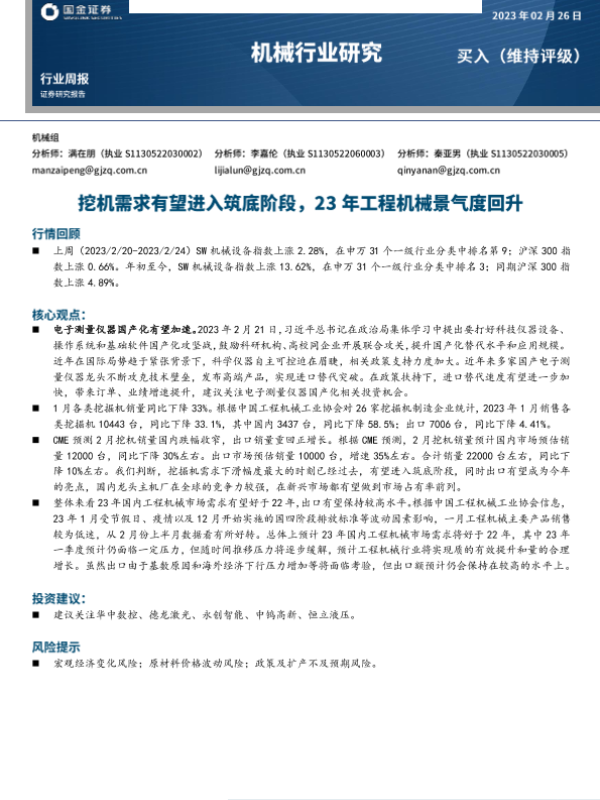 【国金证券】【20230226】机械行业周报:挖机需求有望进入筑底阶段,23年工程机械景气度回升-15页
