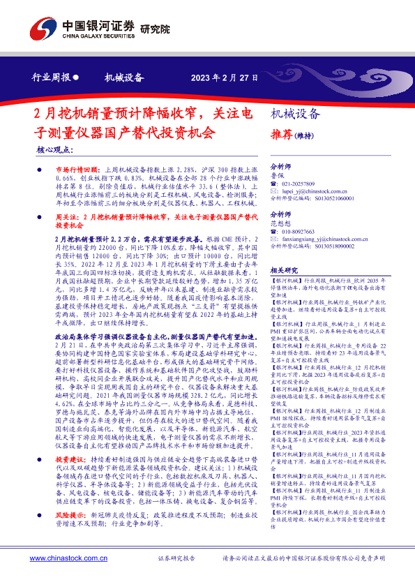 【银河证券】【20230227】机械设备行业周报:2月挖机销量预计降幅收窄,关注电子测量仪器国产替代投资机会-20页