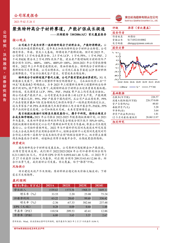 【东亚前海证券】【20230228】沃特股份首次覆盖报告(002886):聚焦特种高分子材料赛道,产能扩张成长提速-28页
