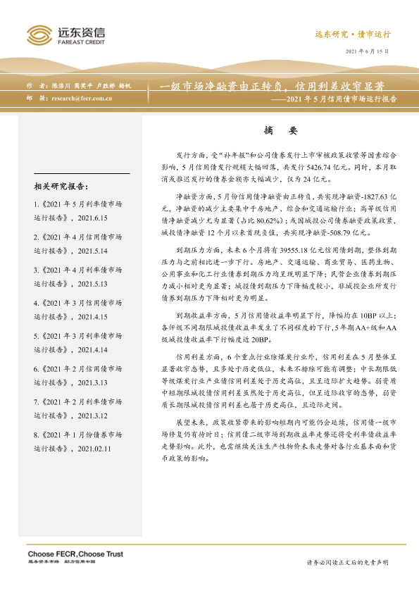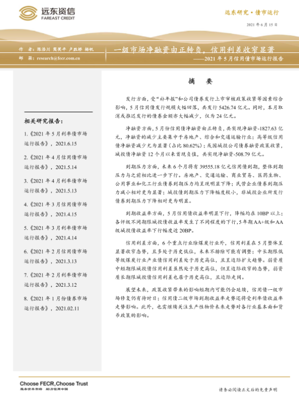 【远东资信】【20210615】2021年5月信用债市场运行报告:一级市场净融资由正转负,信用利差收窄显著-21页