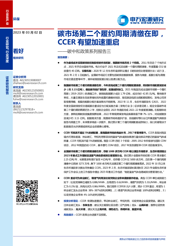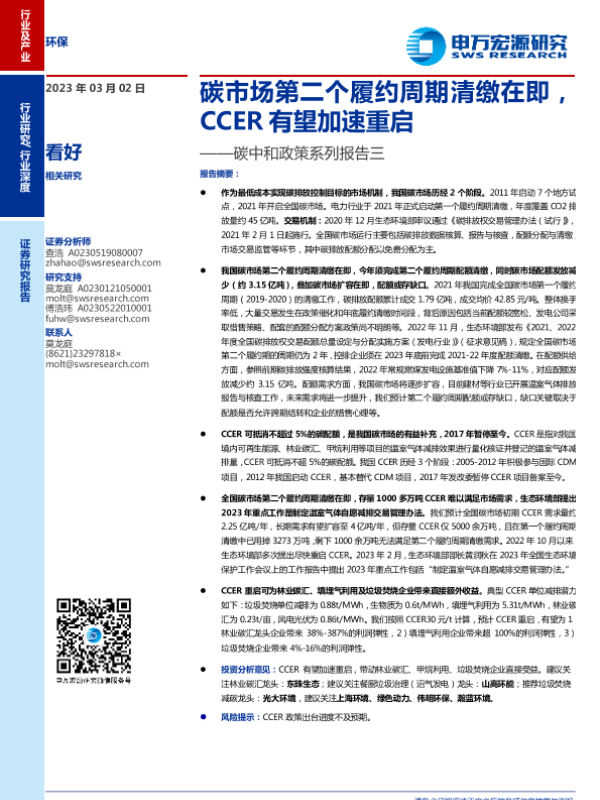 【申万宏源】【20230302】环保行业碳中和政策系列报告三:碳市场第二个履约周期清缴在即,CCER有望加速重启-25页
