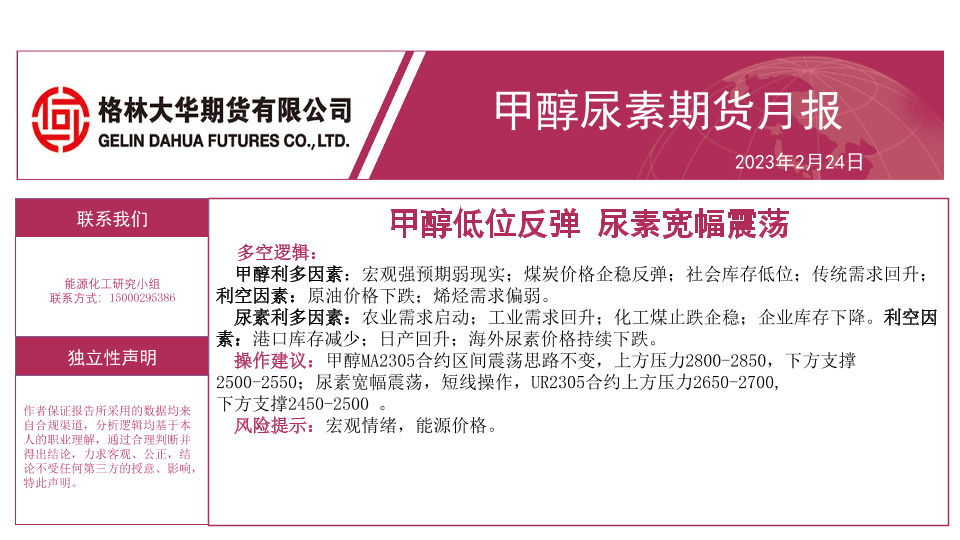 【格林大华期货】【20230224】甲醇尿素期货月报:甲醇低位反弹,尿素宽幅震荡-16页