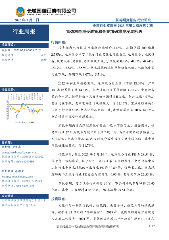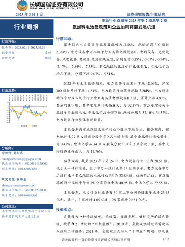 【长城国瑞证券】【20230301】电新行业双周报2023年第2期总第2期:氢燃料电池受政策和企业加码将迎发展机遇-17页