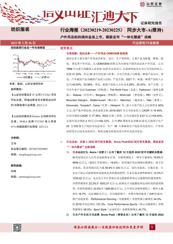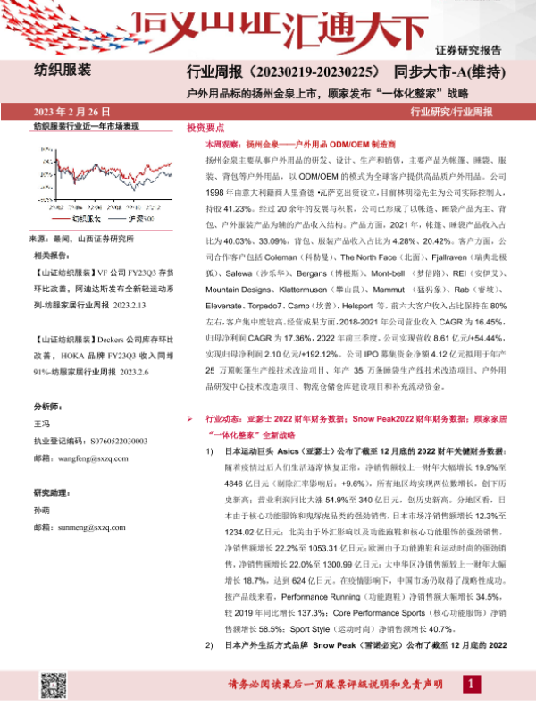 【山西证券】【20230226】纺织服装行业周报:户外用品标的扬州金泉上市,顾家发布“一体化整家”战略-31页