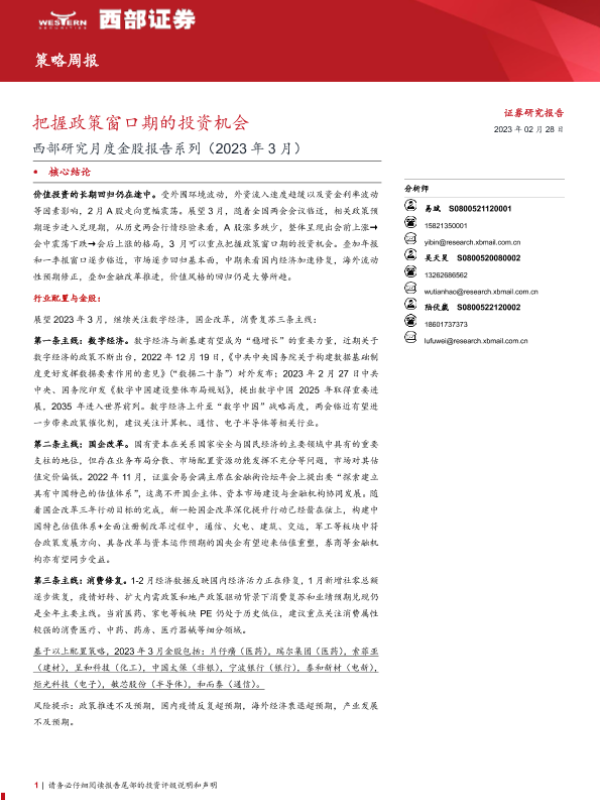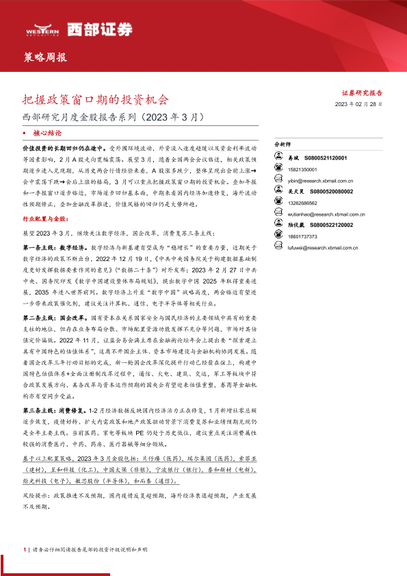 【西部证券】【20230228】西部研究月度金股报告系列(2023年3月):把握政策窗口期的投资机会-15页