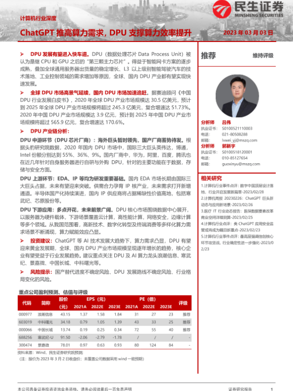 【民生证券】【20230303】计算机行业深度:ChatGPT推高算力需求,DPU支撑算力效率提升-47页