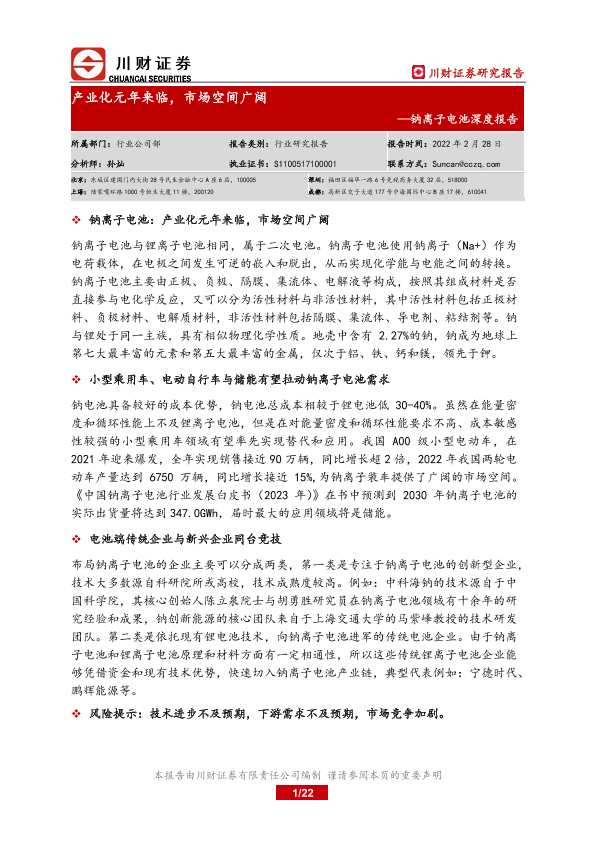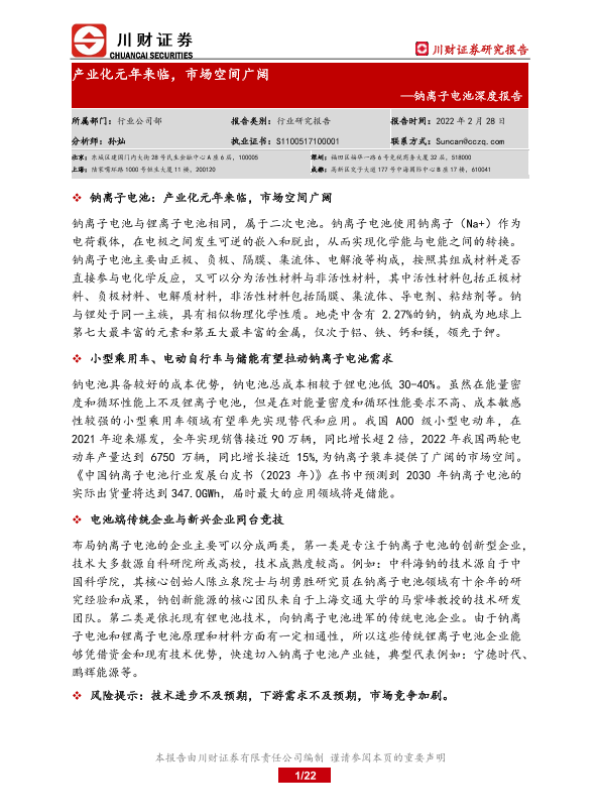 【川财证券】【20230228】钠离子电池行业深度报告:产业化元年来临,市场空间广阔-22页