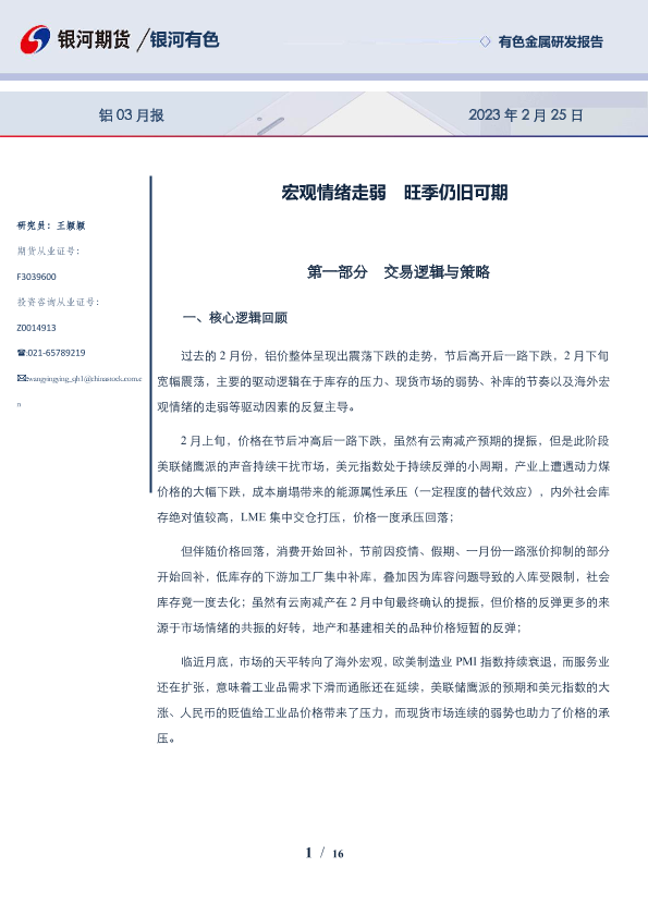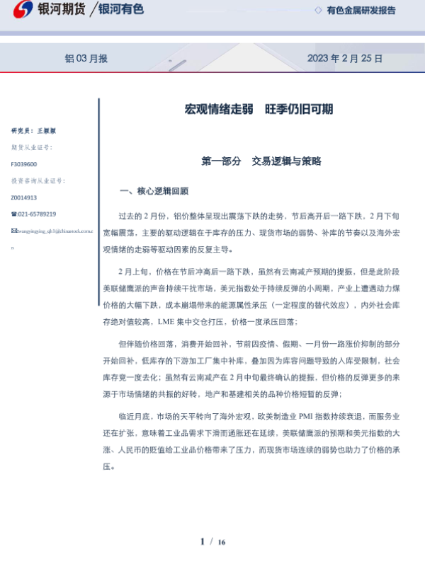 【银河期货】【20230225】铝03月报:宏观情绪走弱,旺季仍旧可期-16页